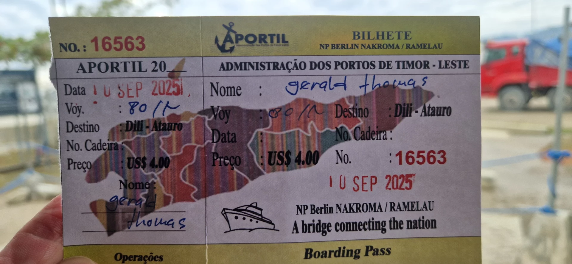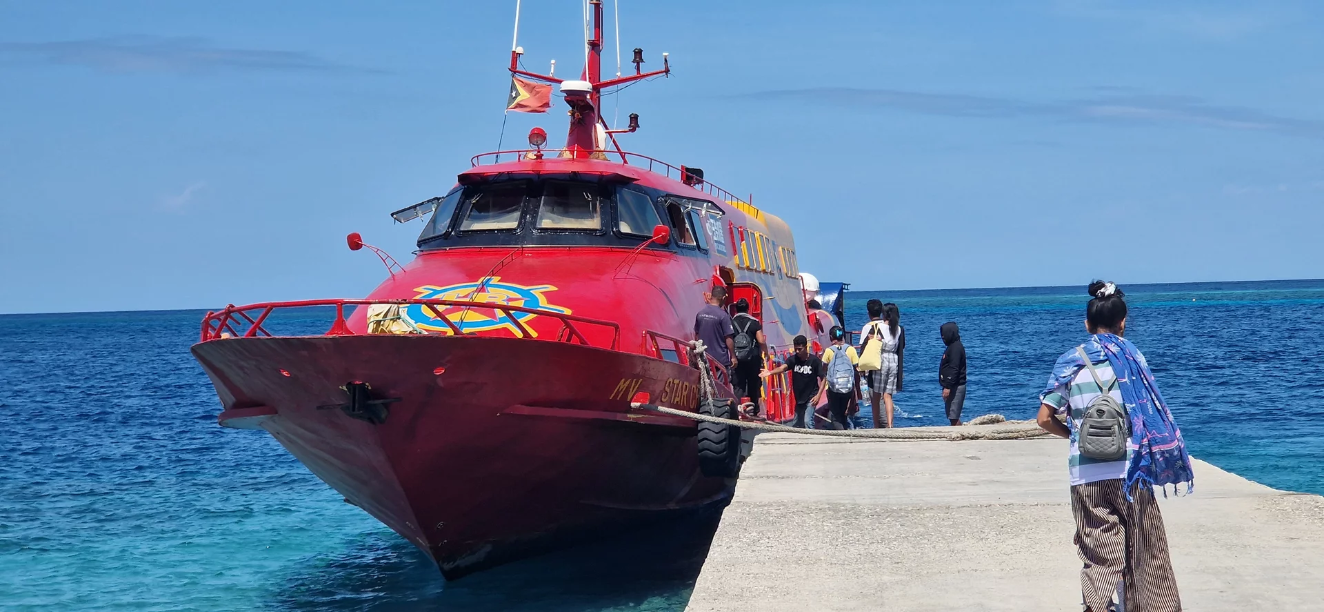 Am frühen Morgen bringt mich ein Fahrer zum Fährhafen von Dili. Von dort legt die Fähre nach Atauro ab – ein knapp dreistündiger Transfer mit dem Schiff „Berlin“, einem Geschenk Deutschlands an Timor-Leste vor etwa 20 Jahren.
